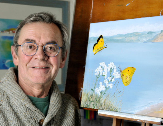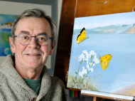 Working in acrylic, watercolour and gouache, Ron has developed a distinctive illustrative style. His subjects range from richly detailed studies of animals, birds and insects to more personal, evocative compositions shaped by memory and subconscious thought. Familiar landmarks of the Jurassic Coast and wider West Country appear throughout his work, though wildlife remains at its heart.